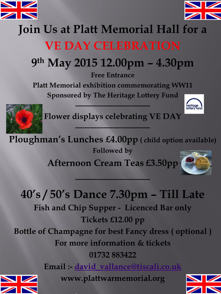 Please join us at Platt Memorial Hall on 9 May 2015 for a 70th Anniversary VE Day Celebration. The hall will be open between midday and 4:30pm when we will be serving ploughman lunches followed by cream teas. Entry is free, however the lunches will cost £4 and the cream teas £3.50. There will also be a celebratory flower display and an exhibition about Platt and its people during the Second World War.